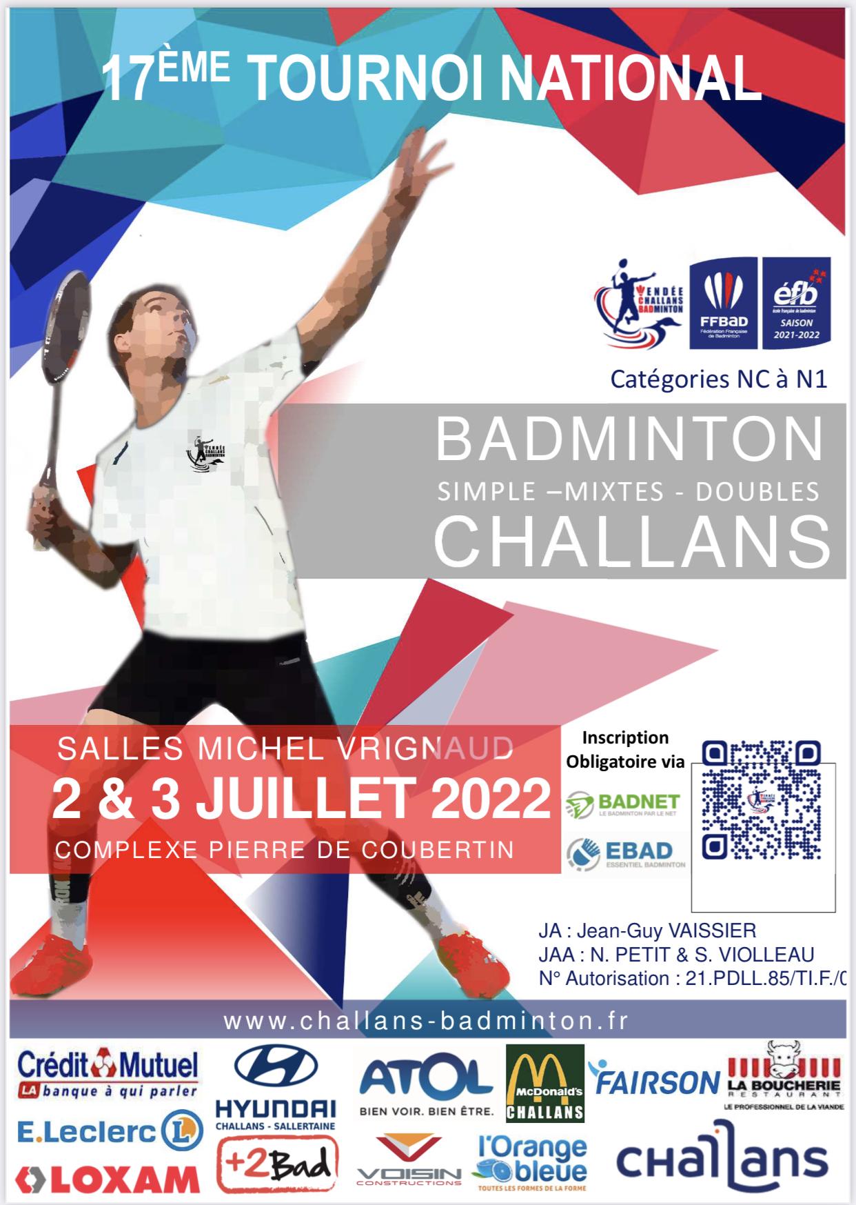 Le VCBAD a le plaisir de vous proposer sa 17ème édition du tournoi National de Challans qui se déroulera le samedi 2 et dimanche 3 juillet prochain !